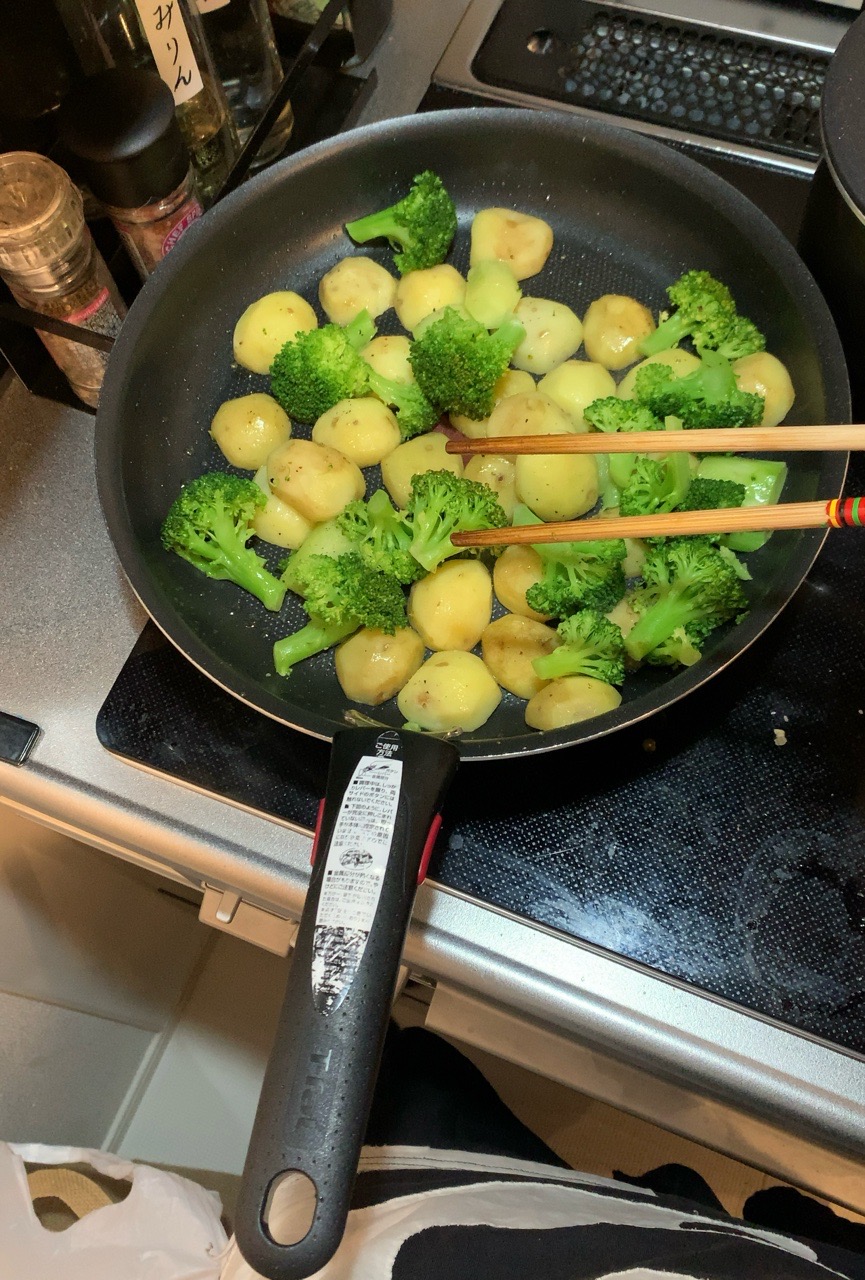 元から相場が安いブロッコリーと、やたら高騰しているジャガイモを規格外品を買う事で安く調達できたので、それらもたっぷり炒めていく。