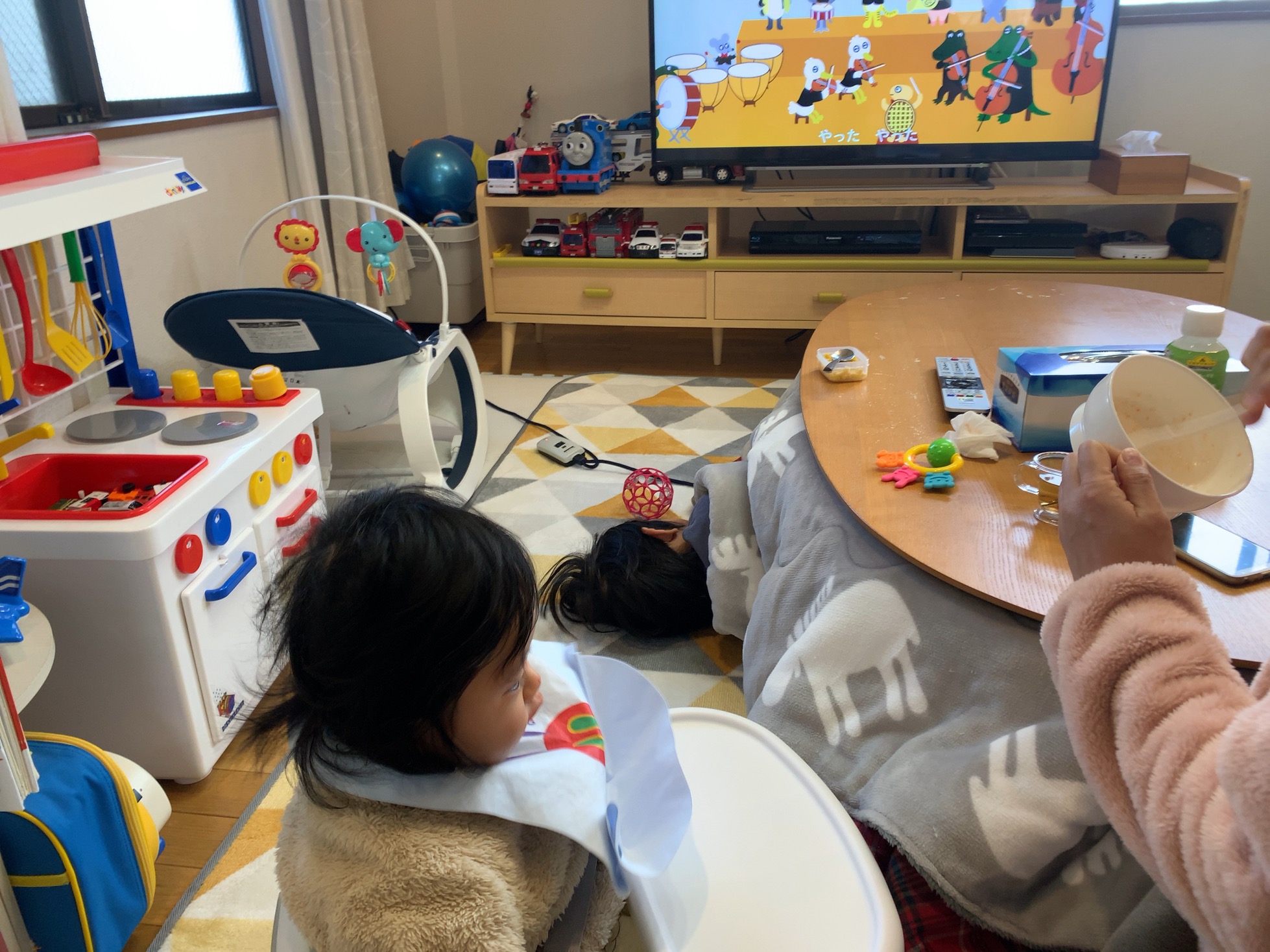 赤ちゃん息子2(0歳8ヶ月)がママからご飯を貰っている。