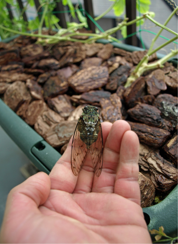 そのベランダには今朝、ミンミンゼミの死骸が…。