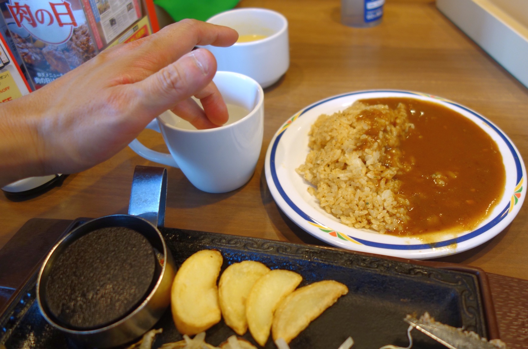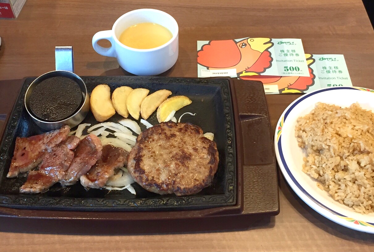 普通のガストみたいに「日替わりランチ」を頼めば安上がりなのだが、わざわざステーキ形態の店に来てまでそれはないと思って、ステーキとハンバーグが食べられるメニューを注文。