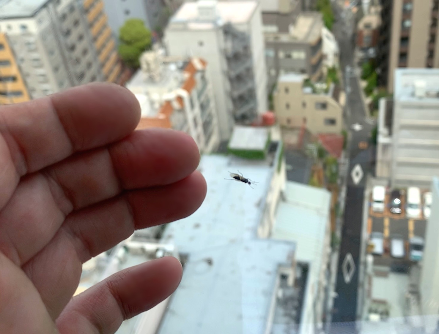 フト見ると、窓の向こう側に羽アリみたいな小虫が張り付いていて、こんな10階以上の所によく居るな……と。