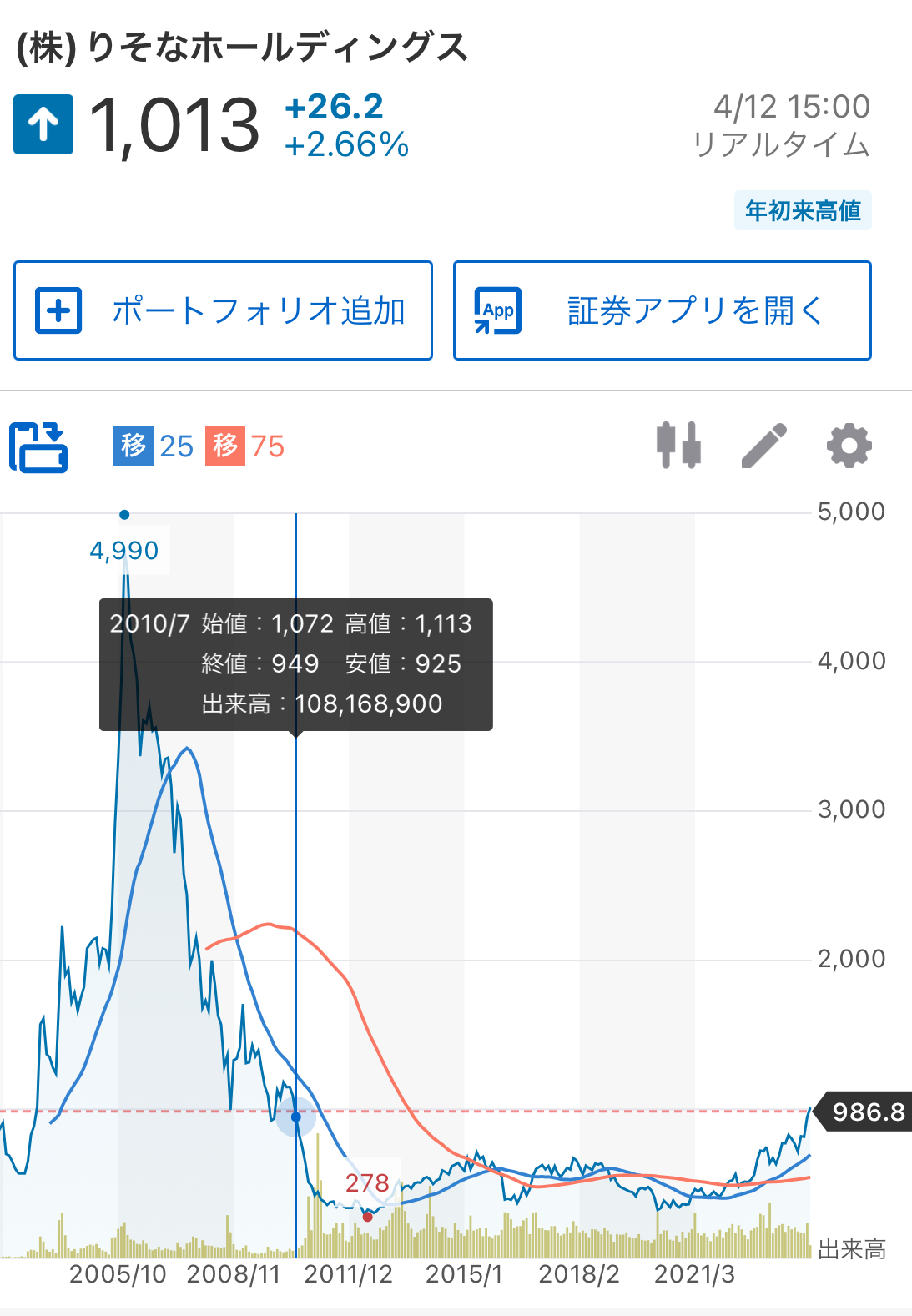 りそな銀行は、かつての公的資金注入以降も低迷が続き、2010年7月を最後に株価は1,000円を上回ることがなかった。