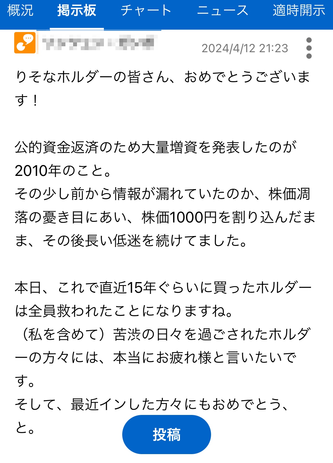 Yahoo!ファイナンスの掲示板には、かつての1,000円以上の頃からの株主と思われる人が感極まっていた。