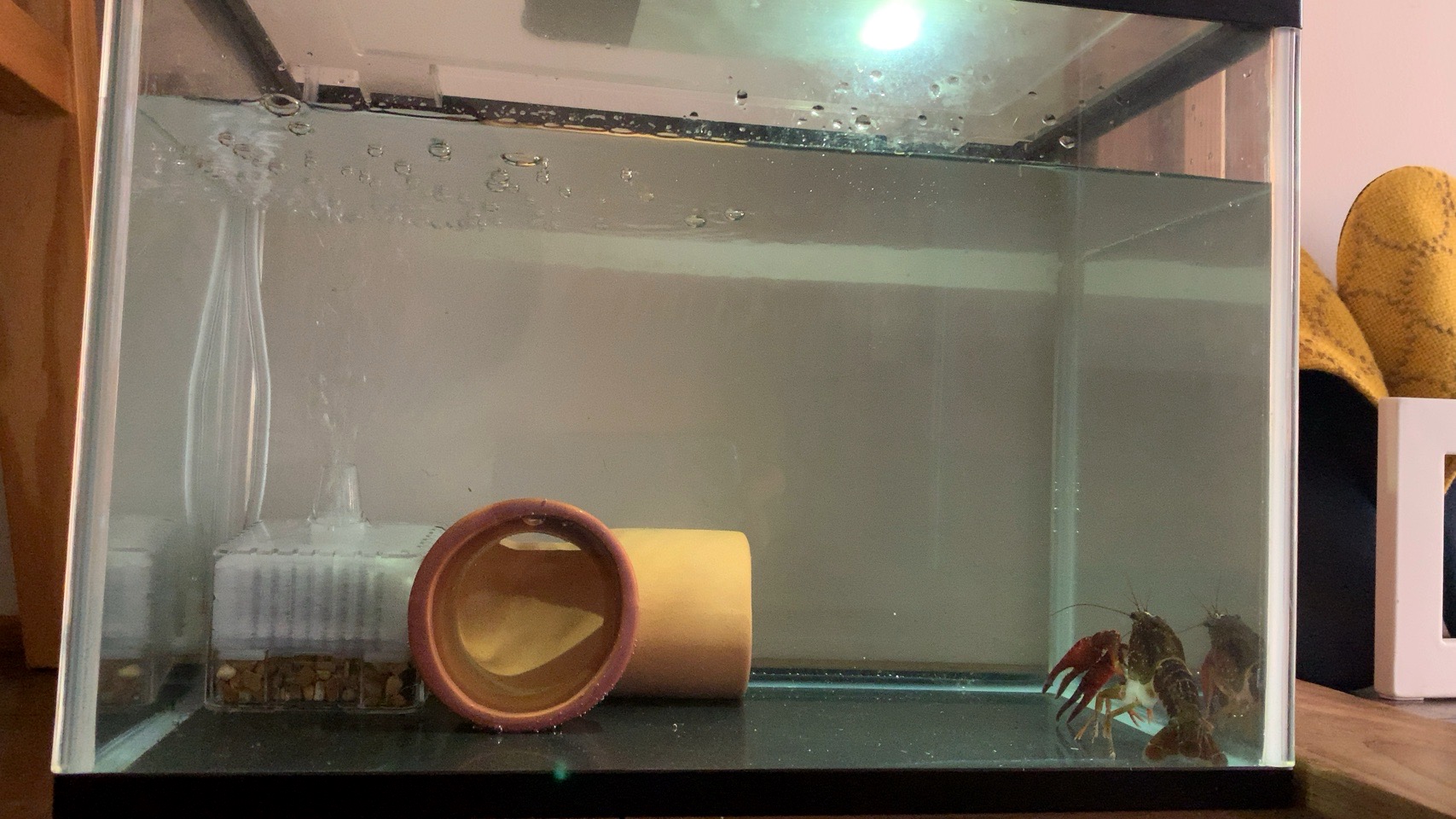 水槽とエアー器材をセットし、水を入れ、カルキ抜きの薬剤を溶かし、土管も入れて完成。