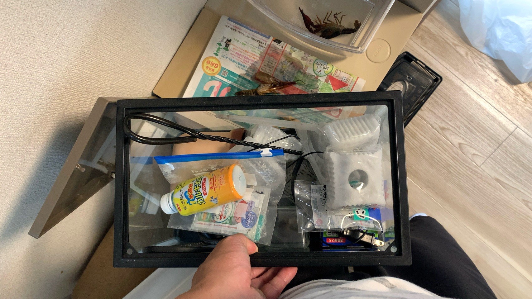 脱皮殻を帰宅後の息子に観察させようと思っていたが、諸般の事情で早々に廃棄し、新しい水槽を運び込む。
