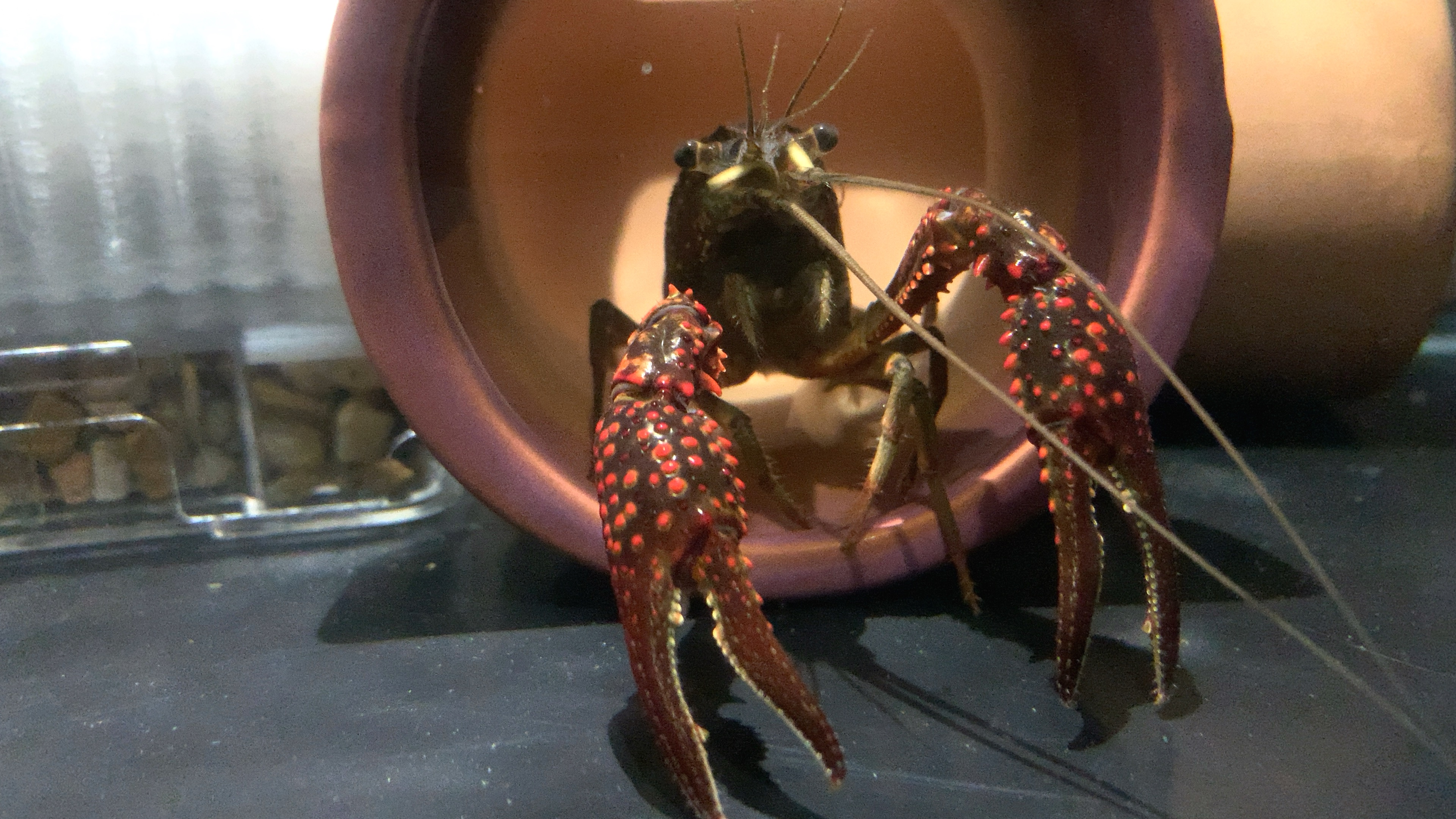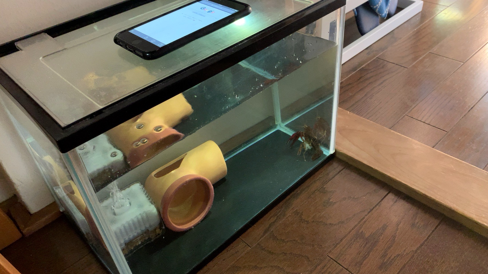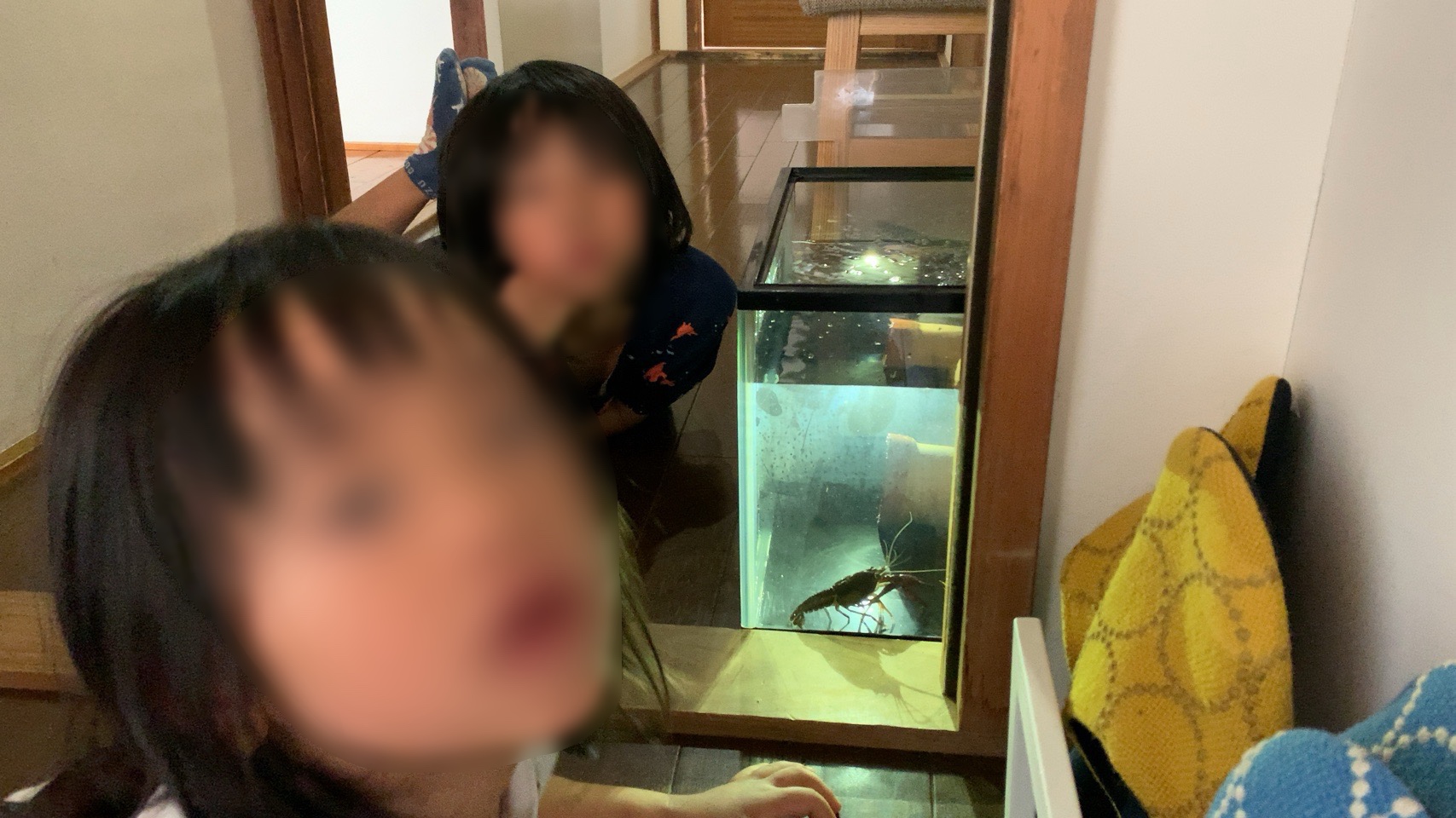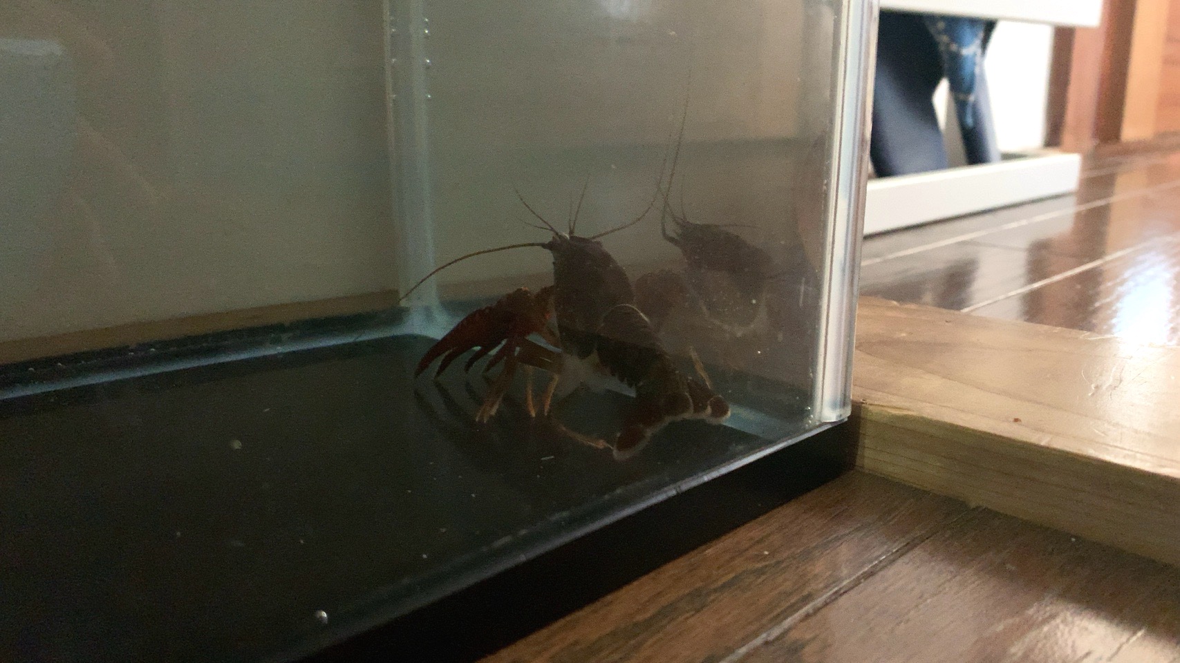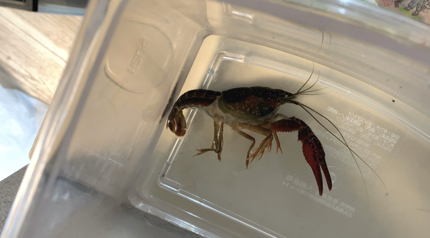 ザリガニは水槽じゅうを歩き回っていて、息子らを喜ばせている。