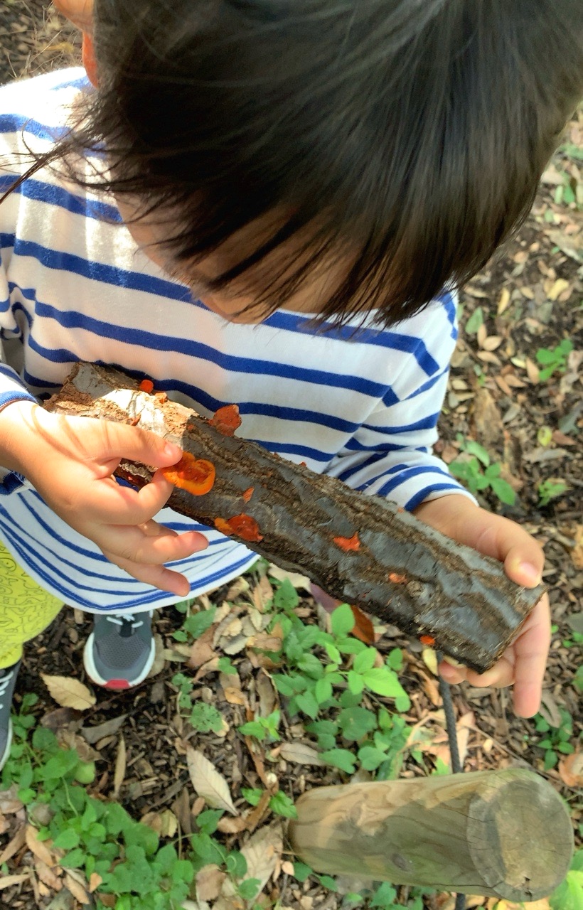自分が“変わり種の松ぼっくり”を探していると、息子2が“変なキノコ”を拾う。