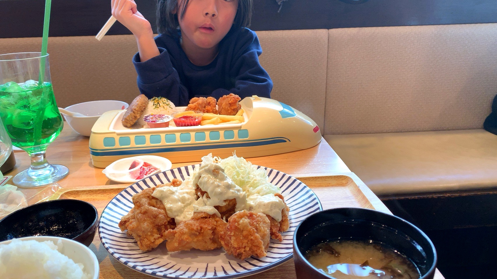 タルタルチキン定食(ご飯大盛り無料)と、お子様ランチが来た。