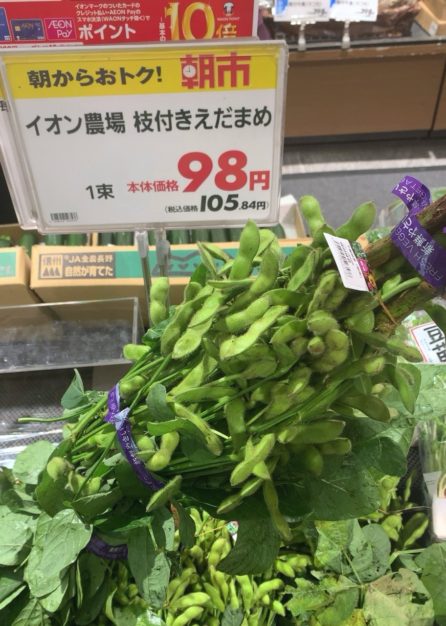 朝市で「枝に付いた枝豆」を発見、千葉の柏市で採れたものらしい。