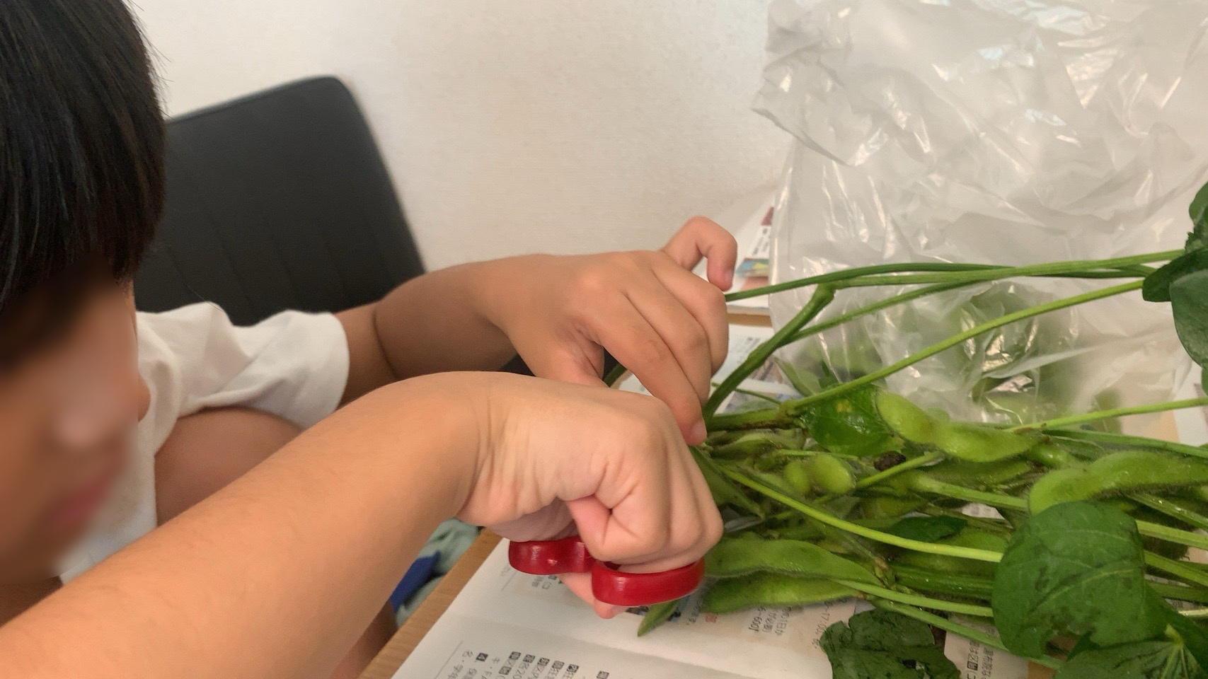 さて、「枝から枝豆を切り離す作業」を、息子もやりたいと言うので、ハサミを持って一緒にやる。
