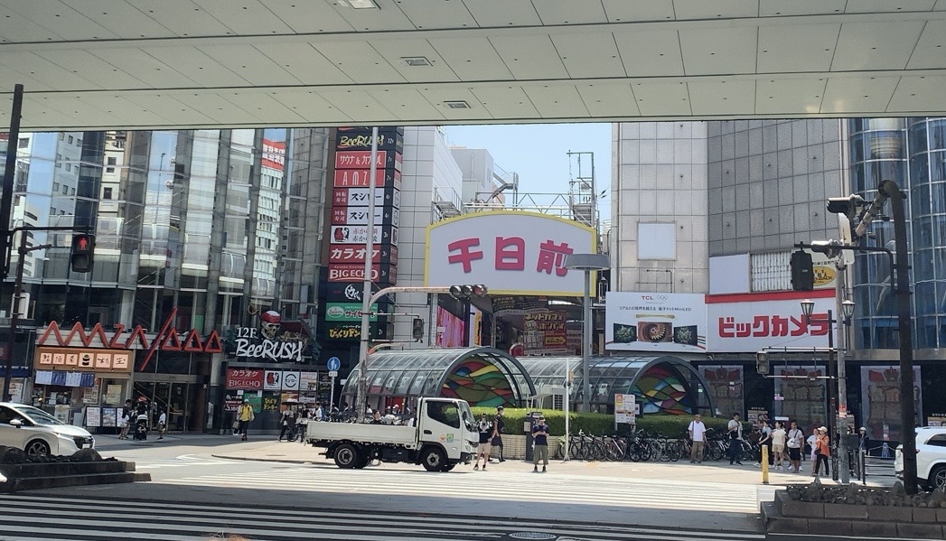 難波へ行く途中の千日前の大通りで、暑さが限界に達し、息子も「そこの地下道に降りたい」と言う。