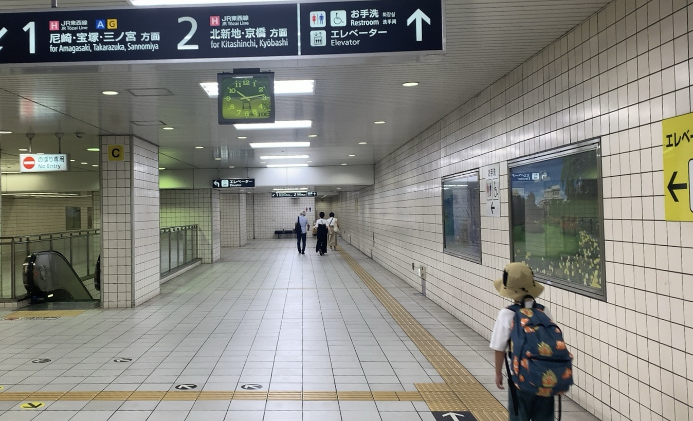 地下鉄・御堂筋線に乗り換え可の表示があったので降りたが、結局のところは「梅田」まで地下道を延々1キロくらい歩かされてしまい、参った。