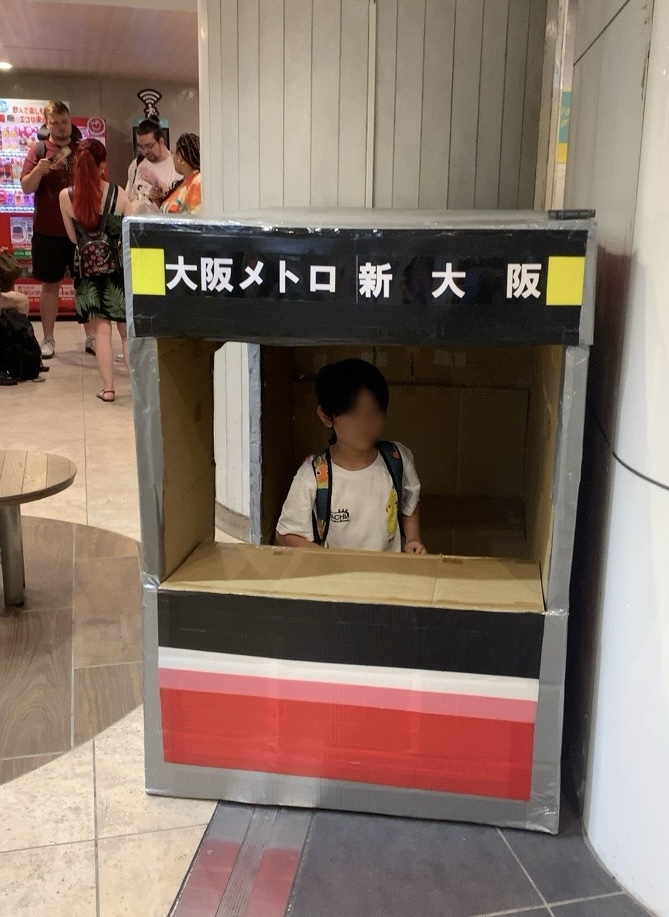 息子は大阪メトロが設置した、あまりにも安っぽい鉄道運転席に入ってポーズを取っている。