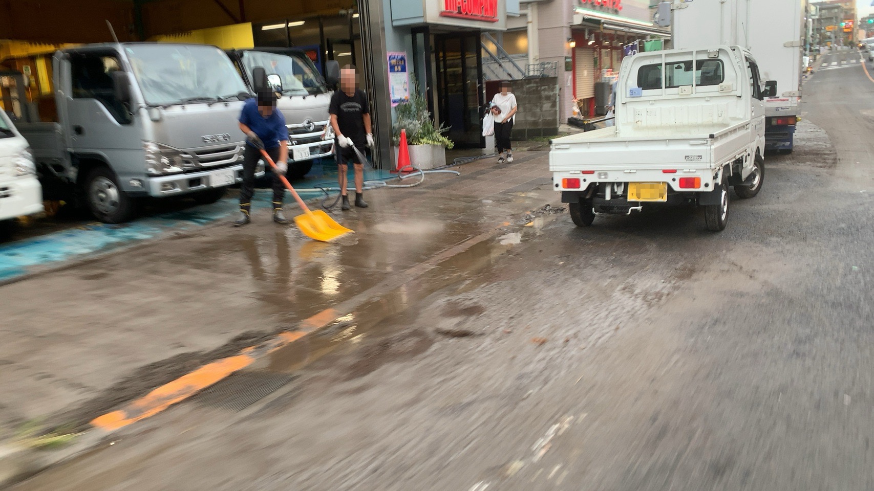 シャッターを半分閉じて、中からモップで泥水を押し返していた。