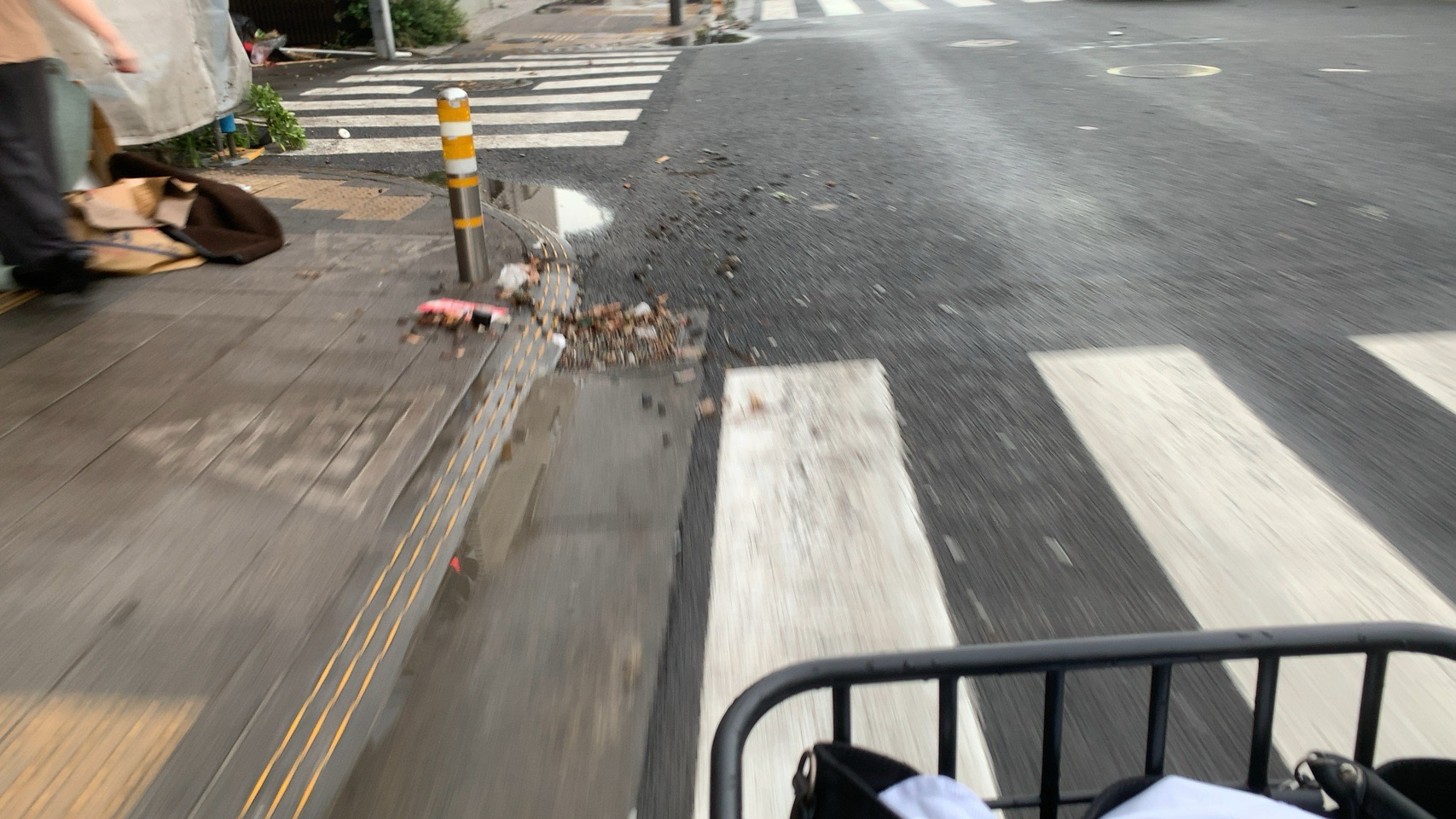 悲惨な低地エリアを脱出し、高台エリアに上がったので、もう安心かと思いきや、街路樹の枝がポッキリ折れて垂れ下がっていたり、車道にゴミが流出していたりと、それなりに悲惨だ。