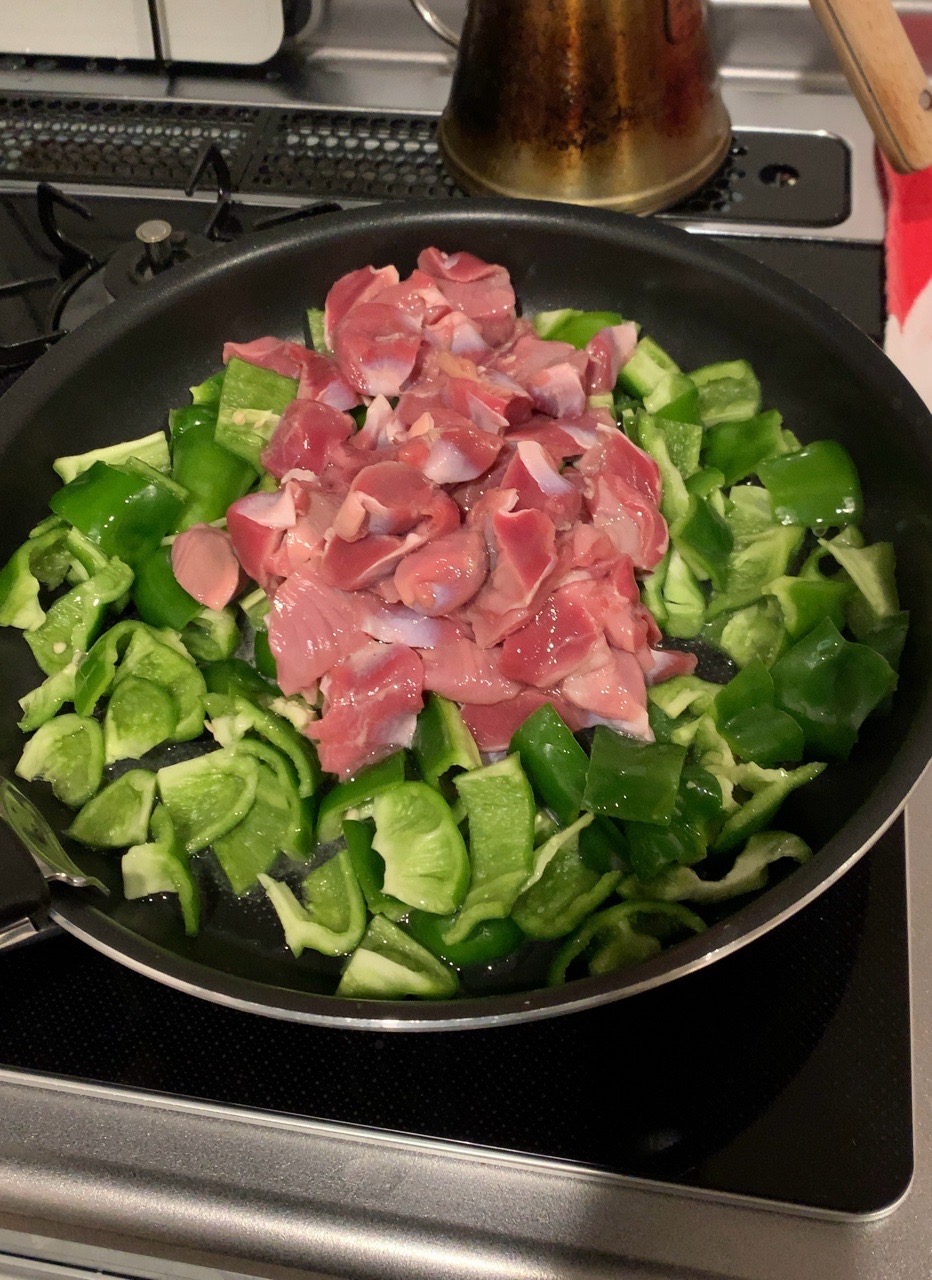 急いで保育園に直行して息子2を迎え、帰ると「砂肝とピーマンの炒め」と「さつまいも味噌汁」を作る。