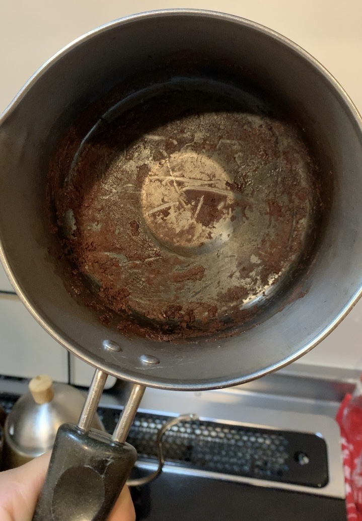溶かし終わった鍋だが、底や側面にチョコの残滓がこびりついて、取れない!
