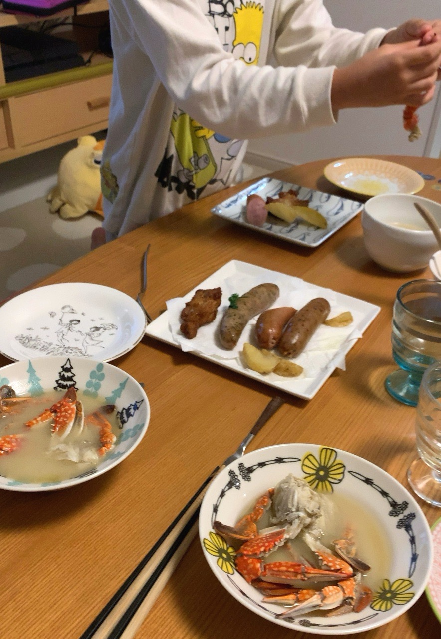 ダシ取りメインの蟹なので身はほとんど入っていないのだが、息子があきらめきれず、手で割っては身を取り出している。