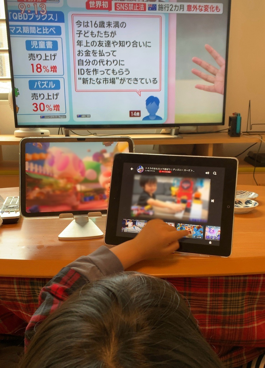 保育園から帰ってきた息子2(4歳)だが、タブレットを2台並べ、別々の動画を再生し、同時か交互に見ていて驚く。